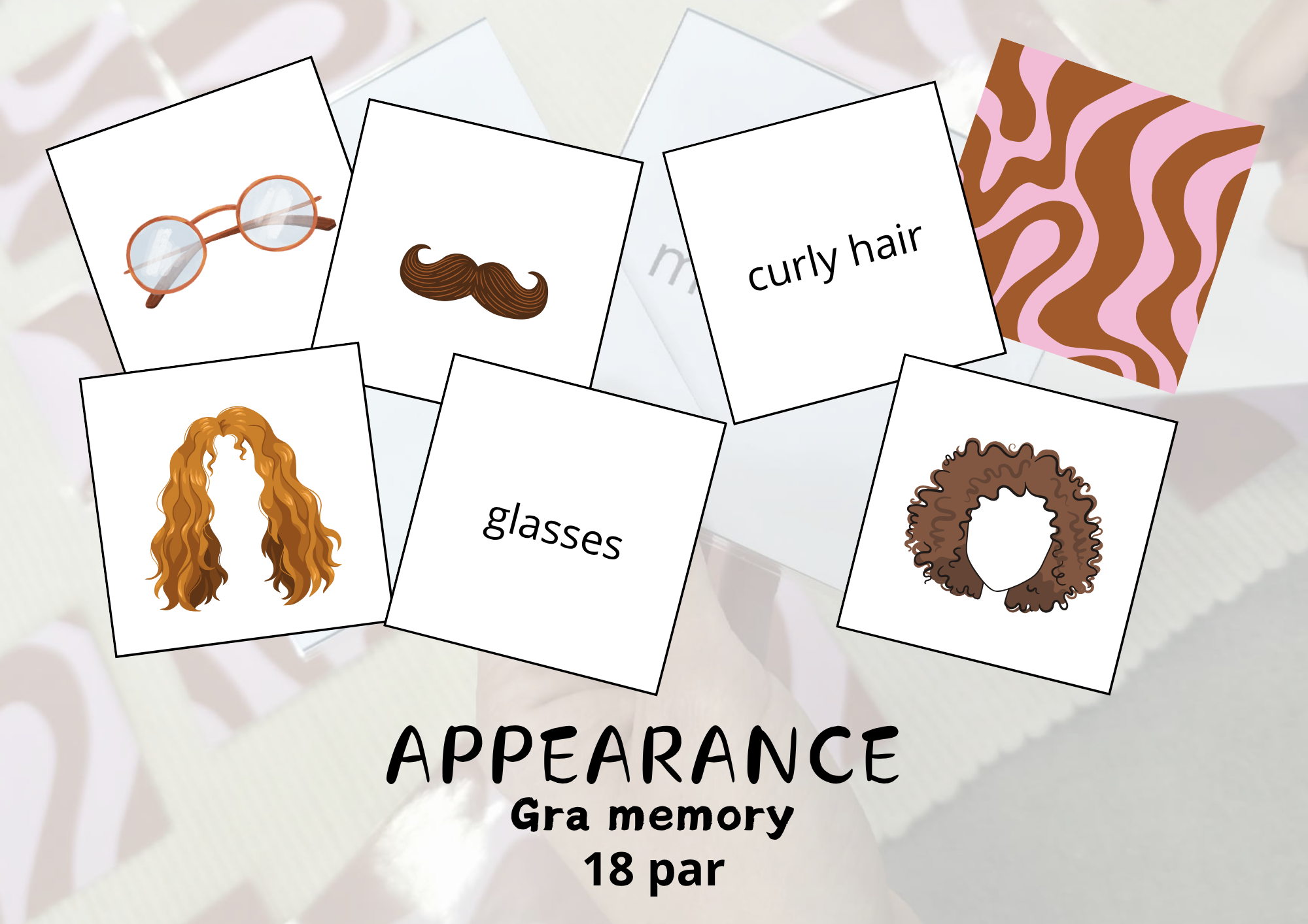 - GRA MEMORY - 36 kart (18 par): 18 kart z ilustracjami, 18 kart z podpisami + wzór na drugą stronę kart (rewers).