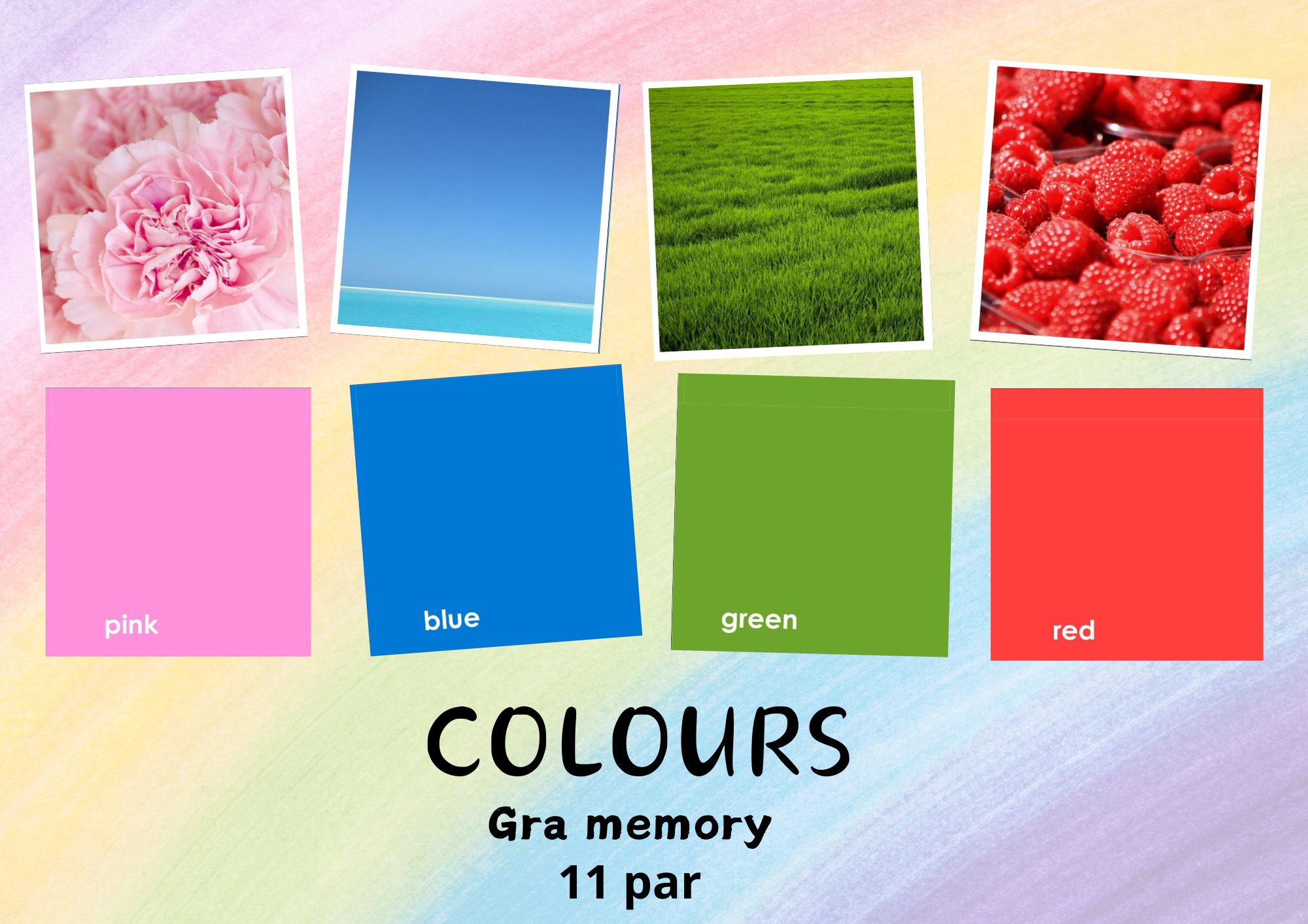 Słownictwo: red, yellow, blue, green, pink, purple, brown, black, white, orange, grey.