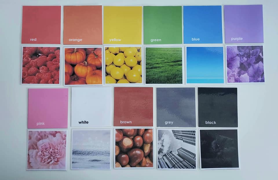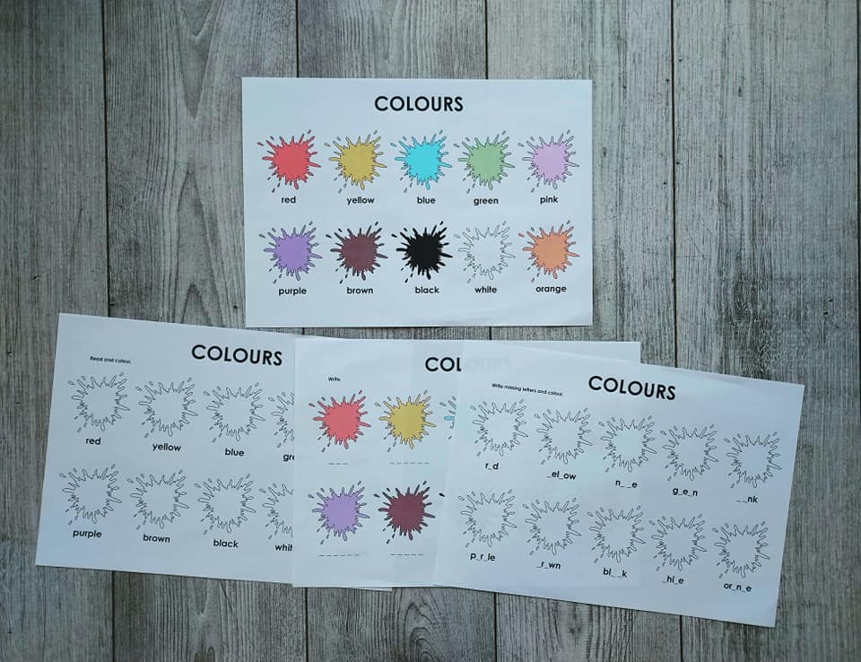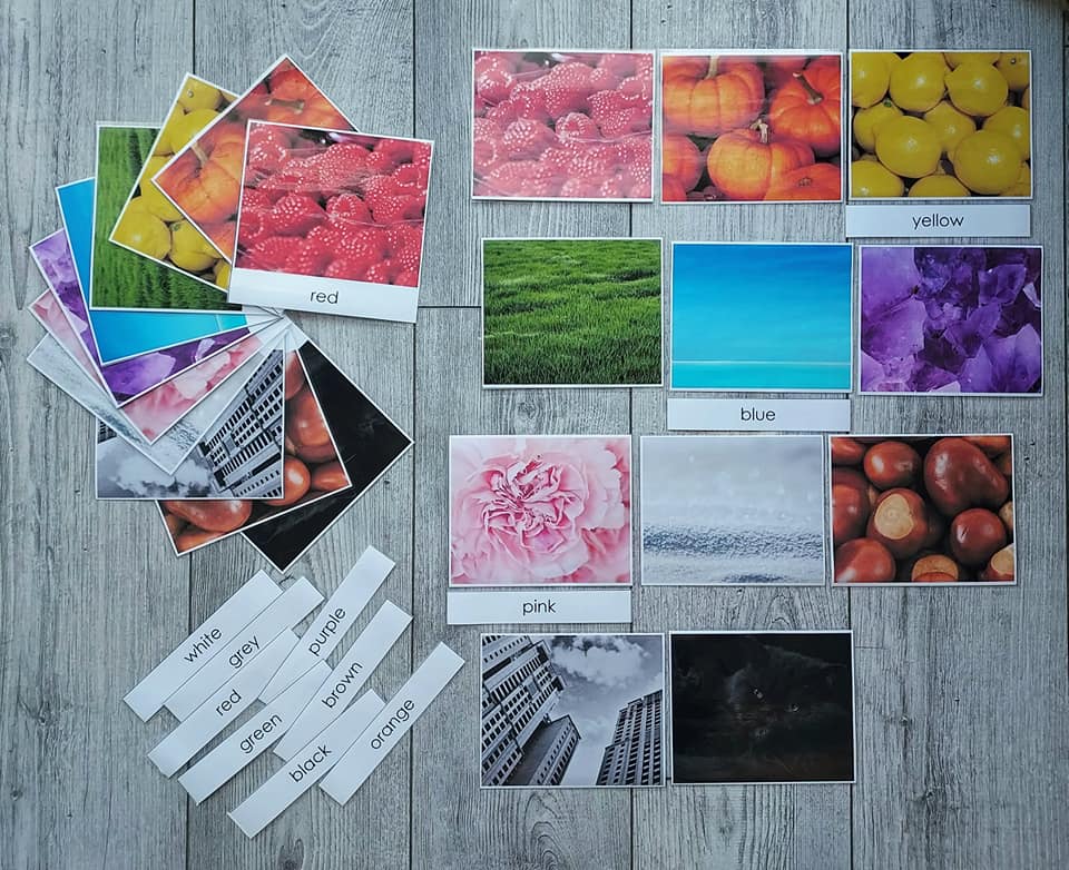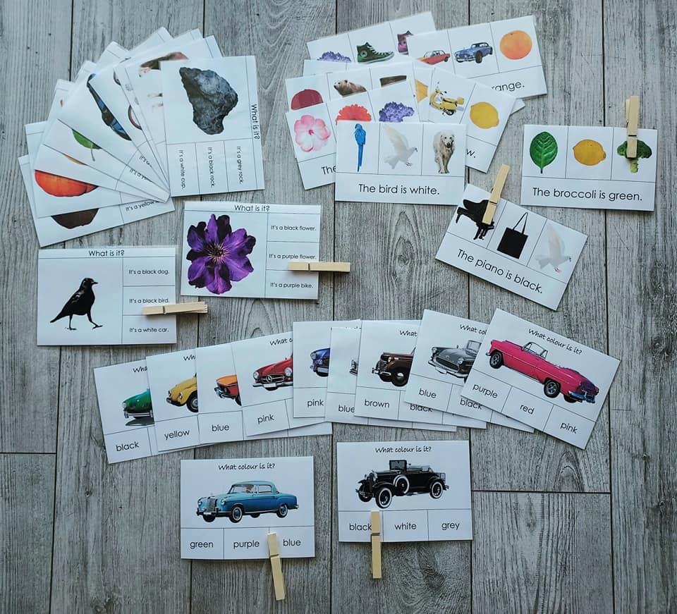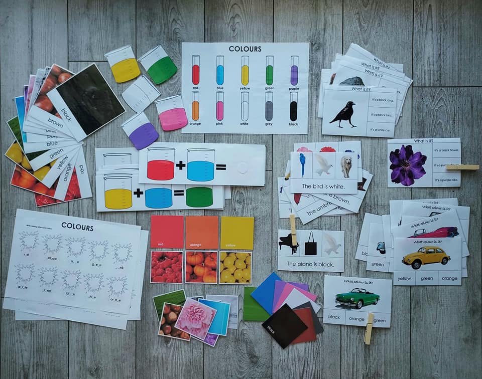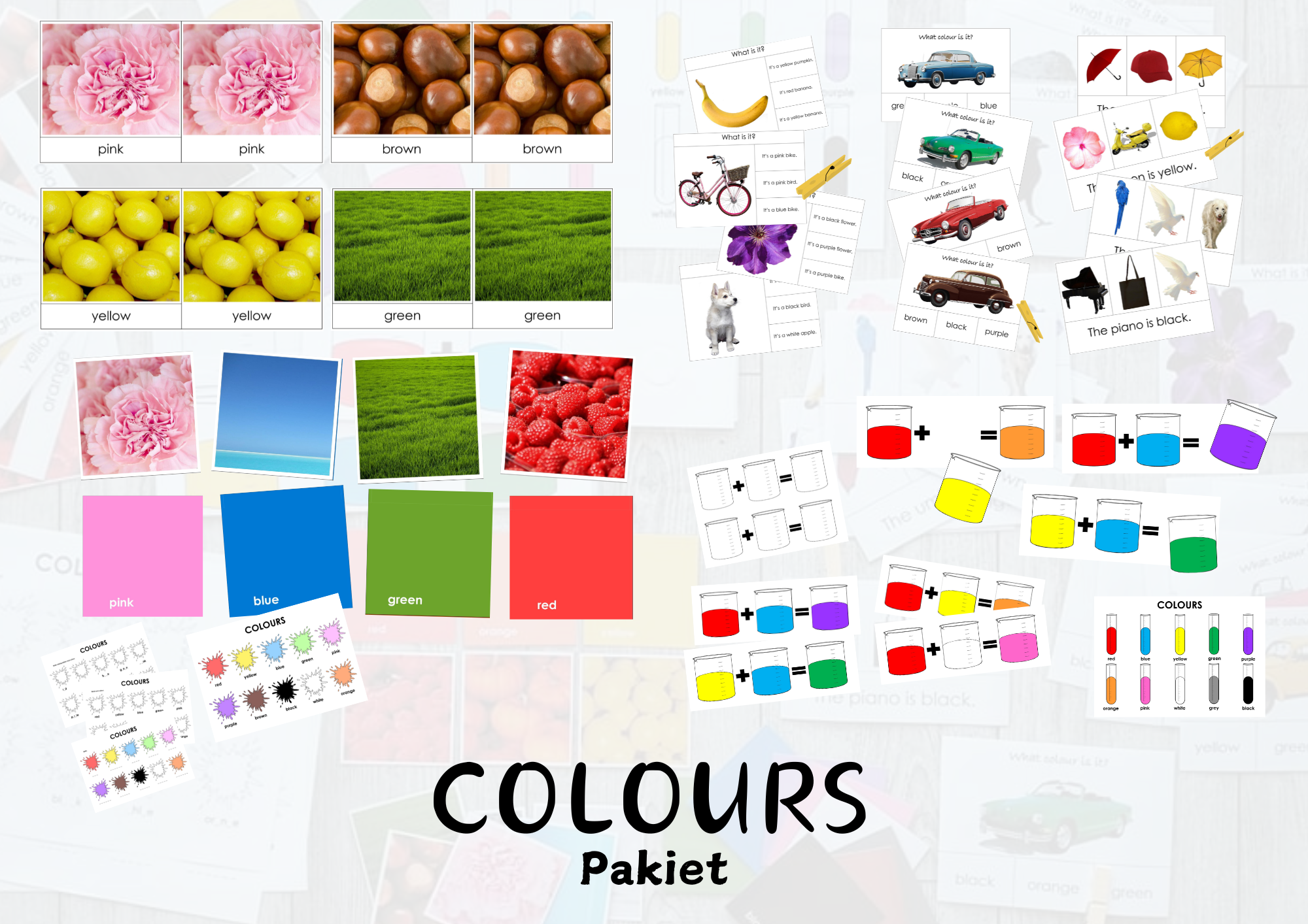- 11 pięknych kart trójdzielnych z nazwami kolorów (ilustracja z napisem, ilustracja oraz napis).