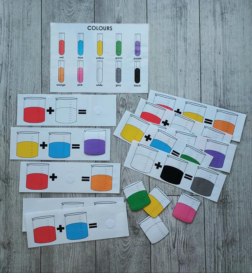 - Mixing colours - karty małego chemika, czyli 5 różnych wariantów mieszania kolorów w formie łączenia ze sobą kolorowych pojemniczków.