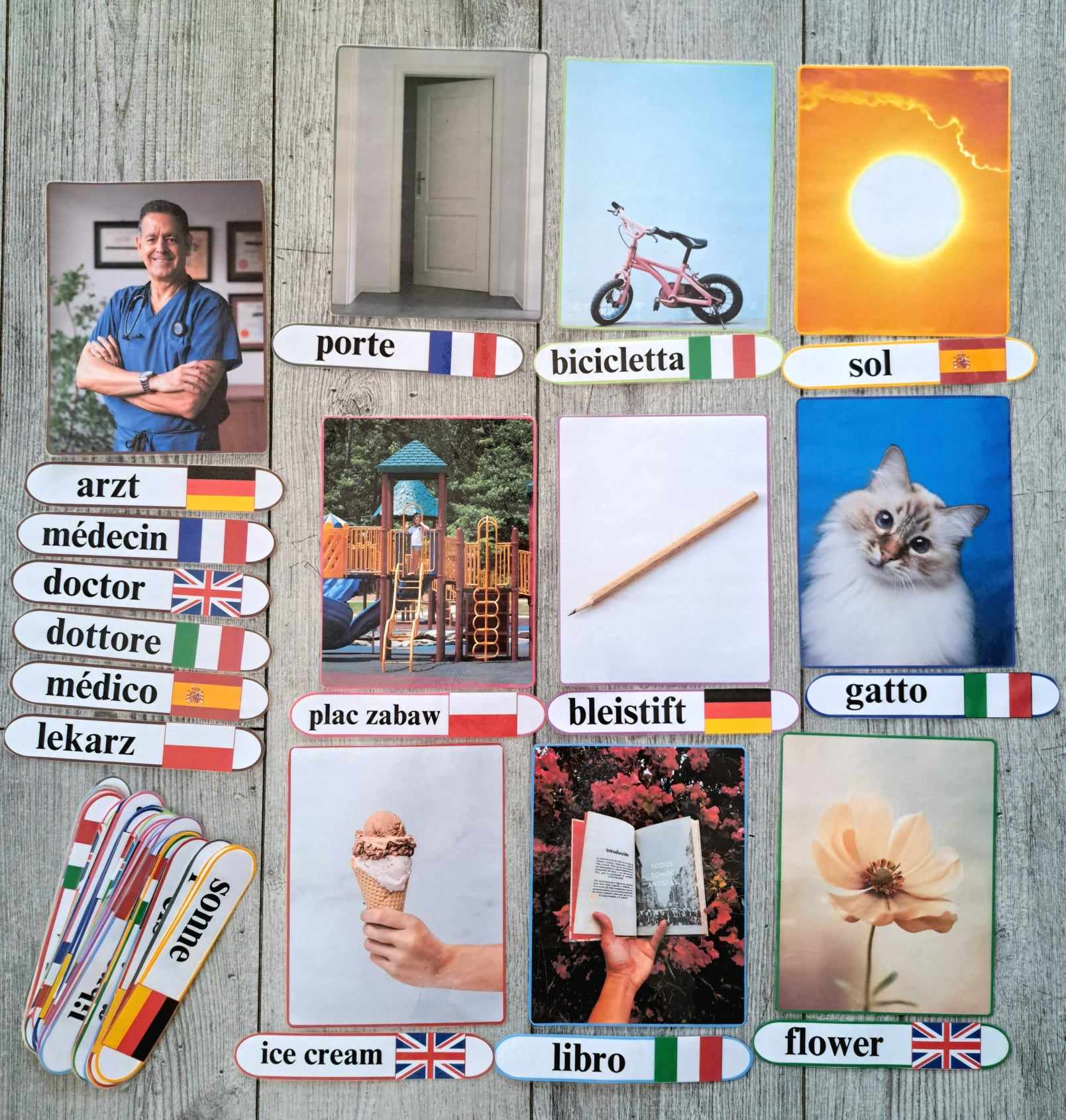 Zestaw zawiera 10 ilustracji przedstawiających: kota, lody, kwiat, słońce, drzwi, plac zabaw, lekarza, ołówek, rower oraz książkę.