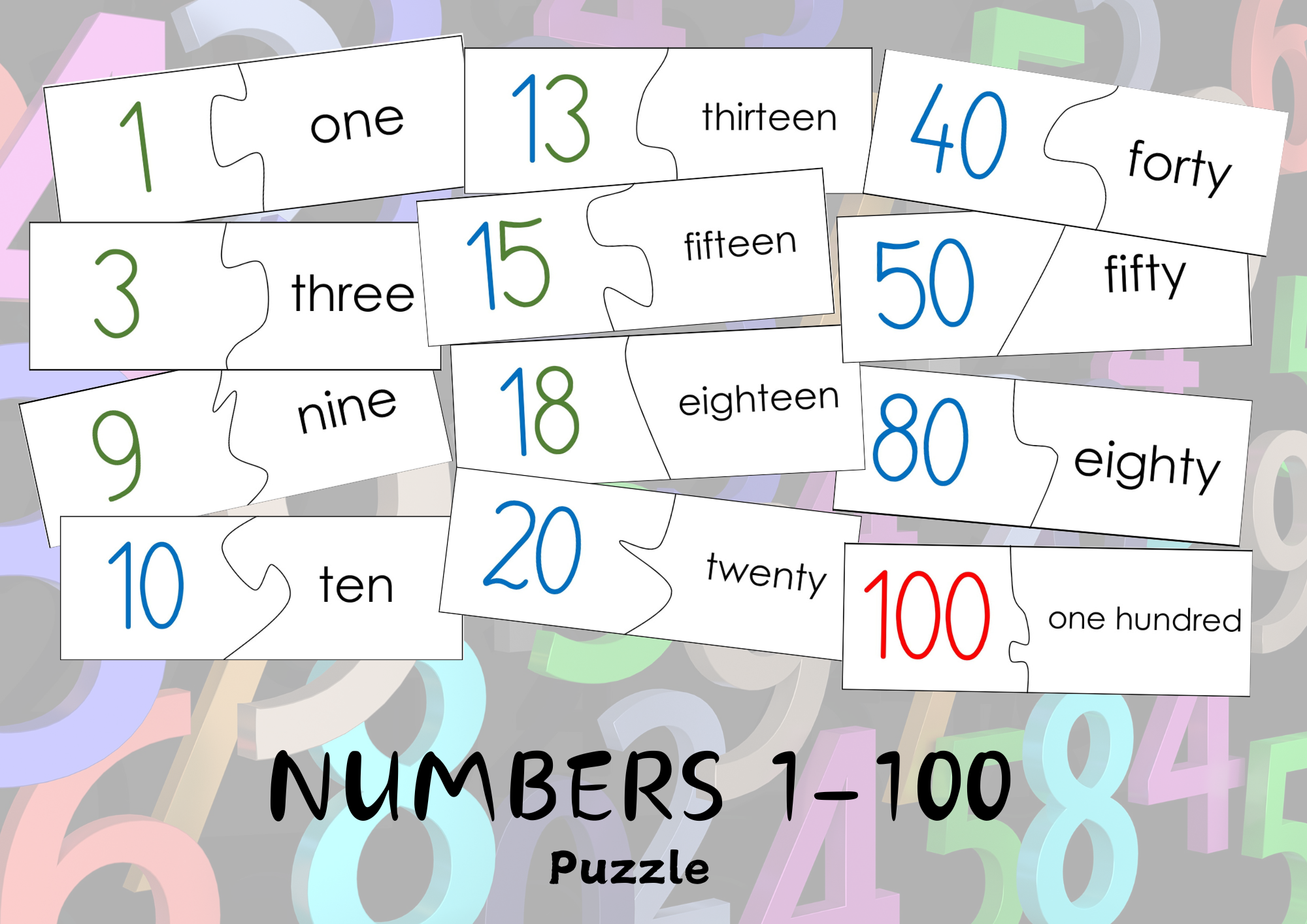 Puzzle: liczba/cyfra + napis (1-10, 10-20, 30, 40, 50, 60, 70, 80, 90, 100).
