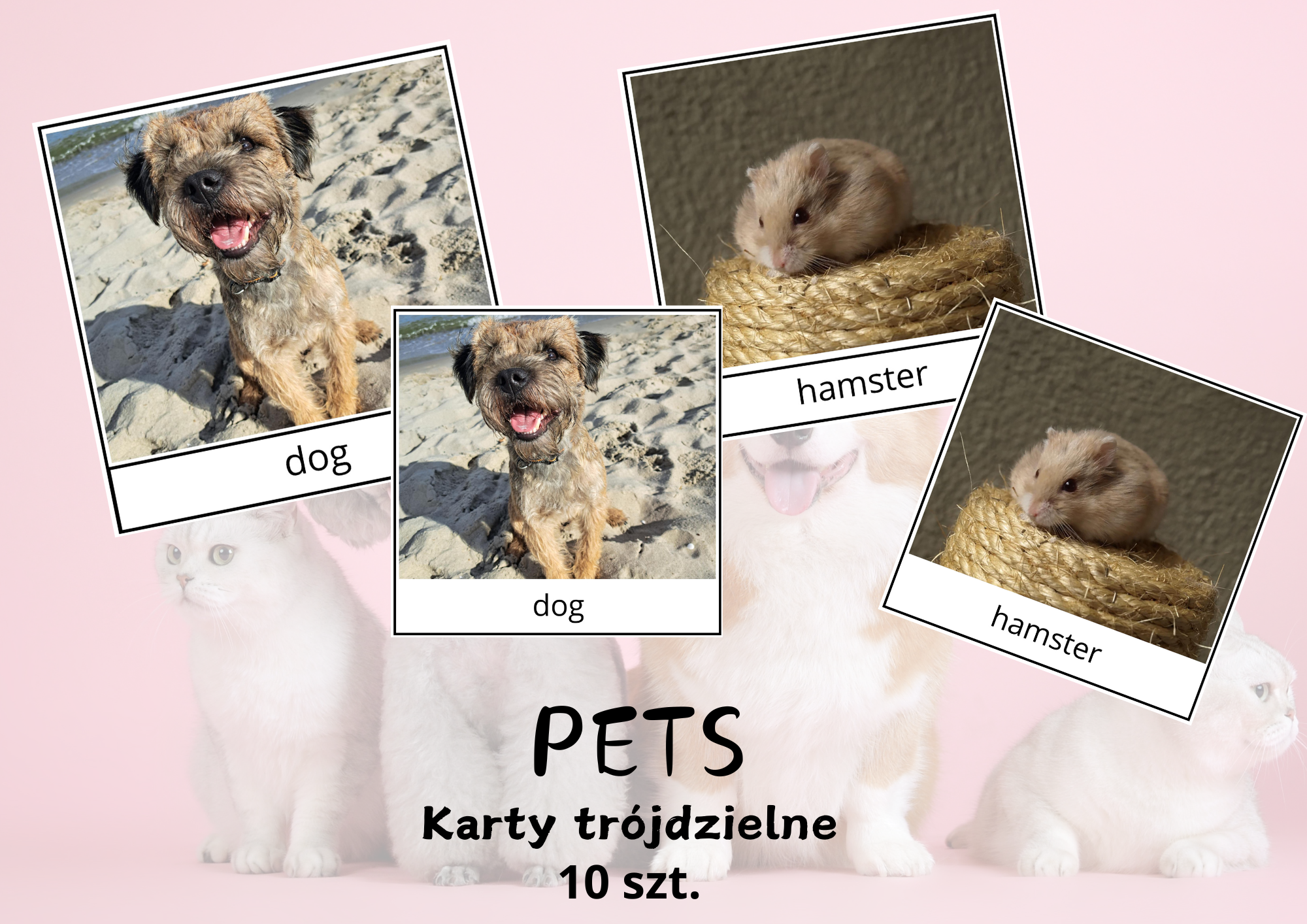 Karty trójdzielne Montessori ze zwierzętami domowymi.