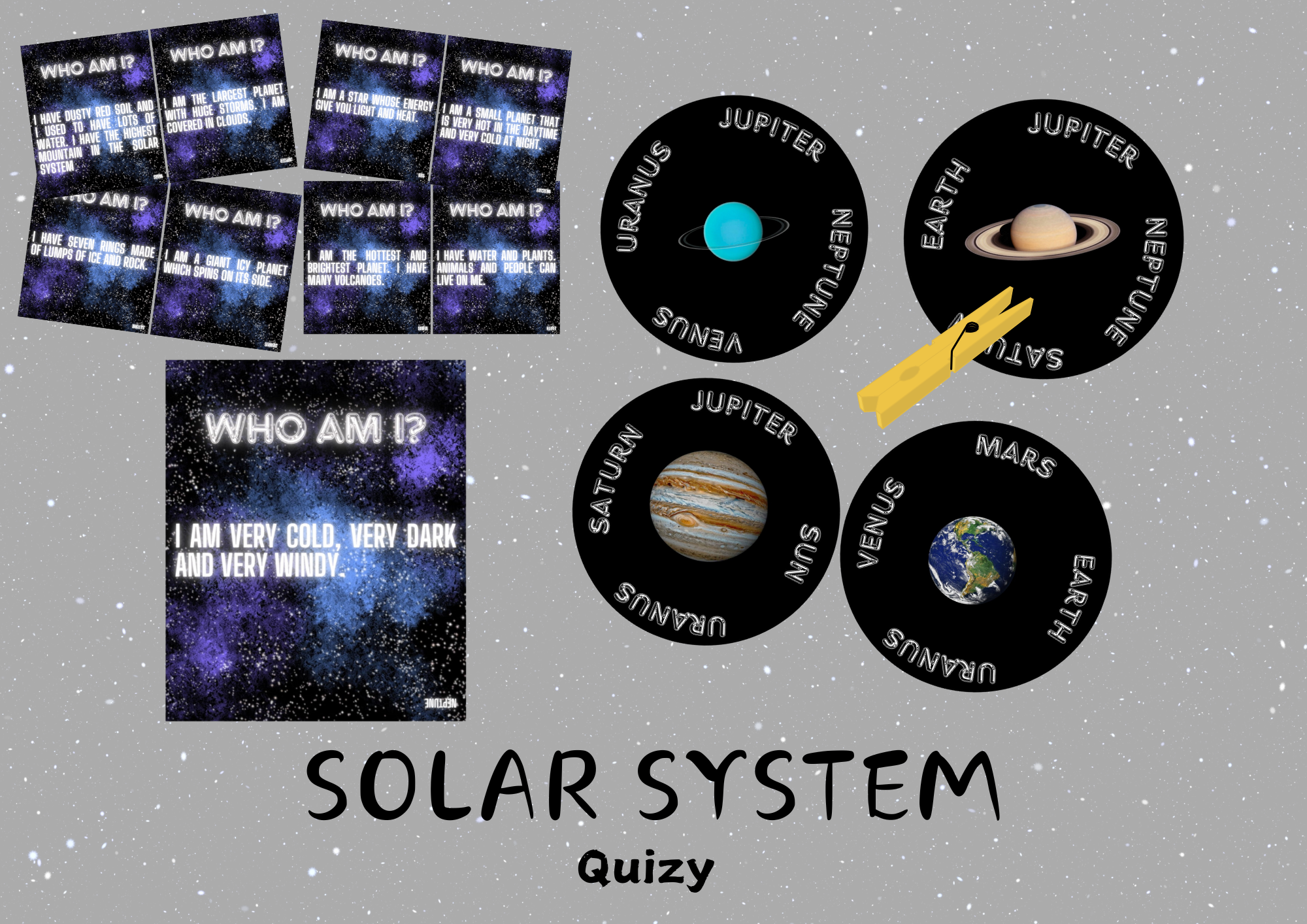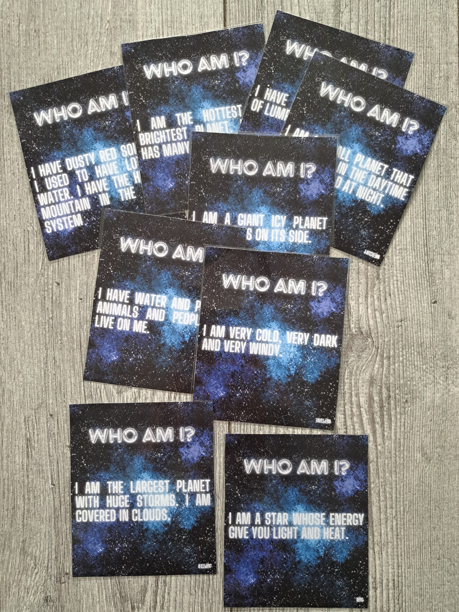 - Who Am I? - 9 kart z krótkimi zagadkami. Odpowiedzi dotyczą konkretnych planet.